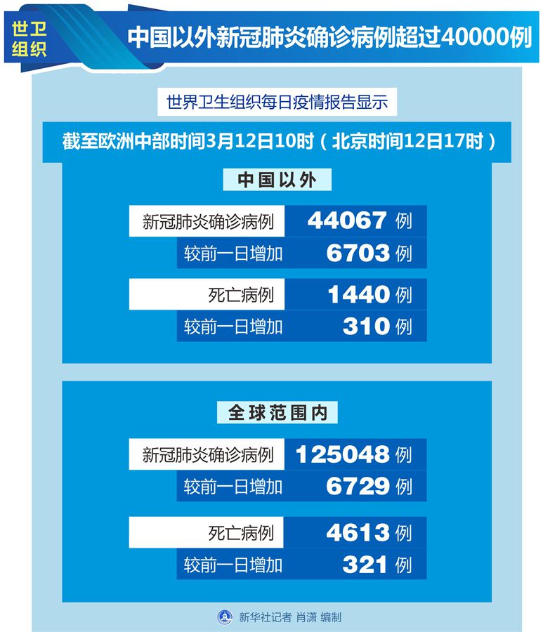 世衛(wèi)組織每日疫情報告顯示,截至歐洲中部時間12日10時(北京時間12日17時),中國以外新冠肺炎確診病例較前一日增加6703例,達(dá)到44067例;中國以外死亡病例較前一日增加310例,達(dá)到1440例。