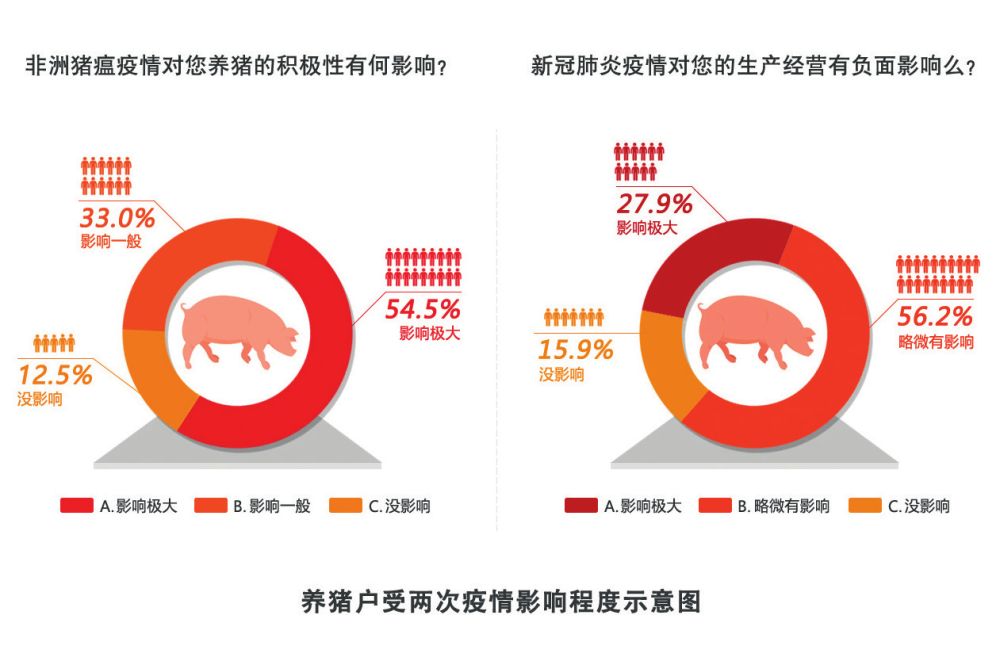 調(diào)查顯示,54.5%的養(yǎng)豬戶認(rèn)為非洲豬瘟疫情對養(yǎng)豬的積極性影響極大,防護(hù)成本高、造成虧損、仔豬成本高,是養(yǎng)豬戶反映非洲豬瘟疫情帶來的最強烈影響,27.9%的養(yǎng)豬戶認(rèn)為新冠肺炎疫情對生產(chǎn)經(jīng)營的負(fù)面影響極大。(見圖1)