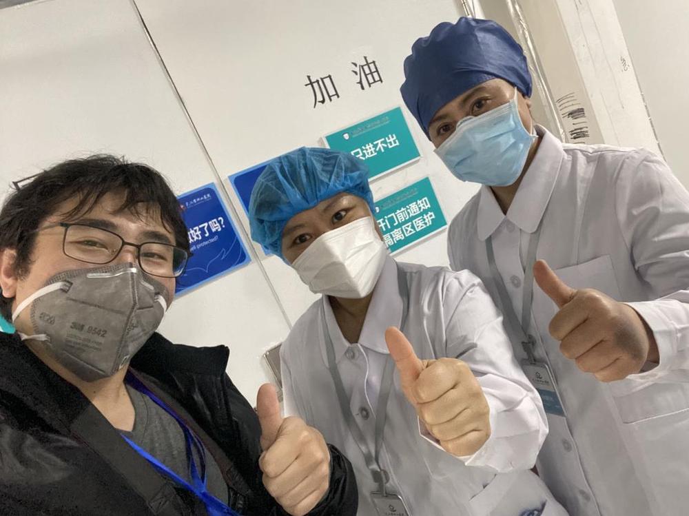 圖為新華社記者許楊與醫(yī)護人員合影。