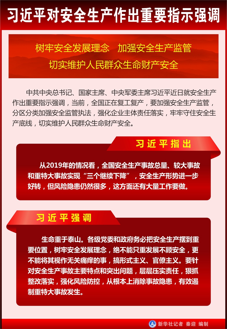 習(xí)近平強(qiáng)調(diào),生命重于泰山。各級黨委和政府務(wù)必把安全生產(chǎn)擺到重要位置,樹牢安全發(fā)展理念,絕不能只重發(fā)展不顧安全,更不能將其視作無關(guān)痛癢的事,搞形式主義、官僚主義。要針對安全生產(chǎn)事故主要特點(diǎn)和突出問題,層層壓實(shí)責(zé)任,狠抓整改落實(shí),強(qiáng)化風(fēng)險(xiǎn)防控,從根本上消除事故隱患,有效遏制重特大事故發(fā)生。
