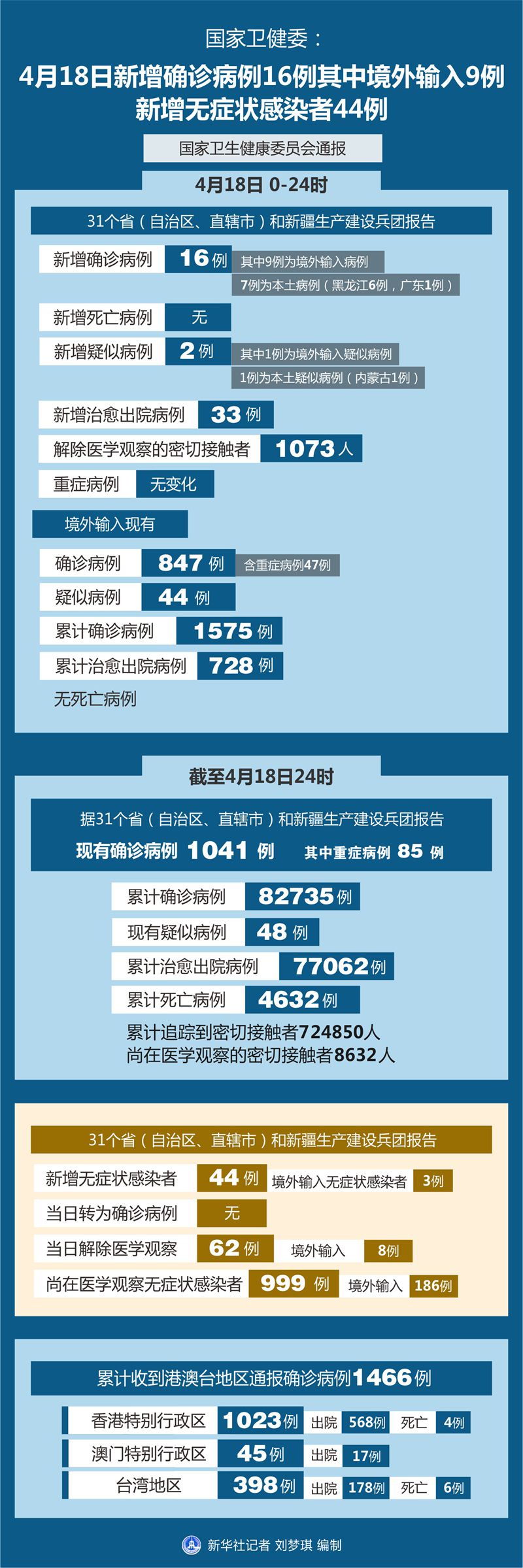 截至4月18日24時,據(jù)31個省(自治區(qū)、直轄市)和新疆生產(chǎn)建設(shè)兵團報告,現(xiàn)有確診病例1041例(其中重癥病例85例),累計治愈出院病例77062例,累計死亡病例4632例,累計報告確診病例82735例,現(xiàn)有疑似病例48例。累計追蹤到密切接觸者724850人,尚在醫(yī)學觀察的密切接觸者8632人。