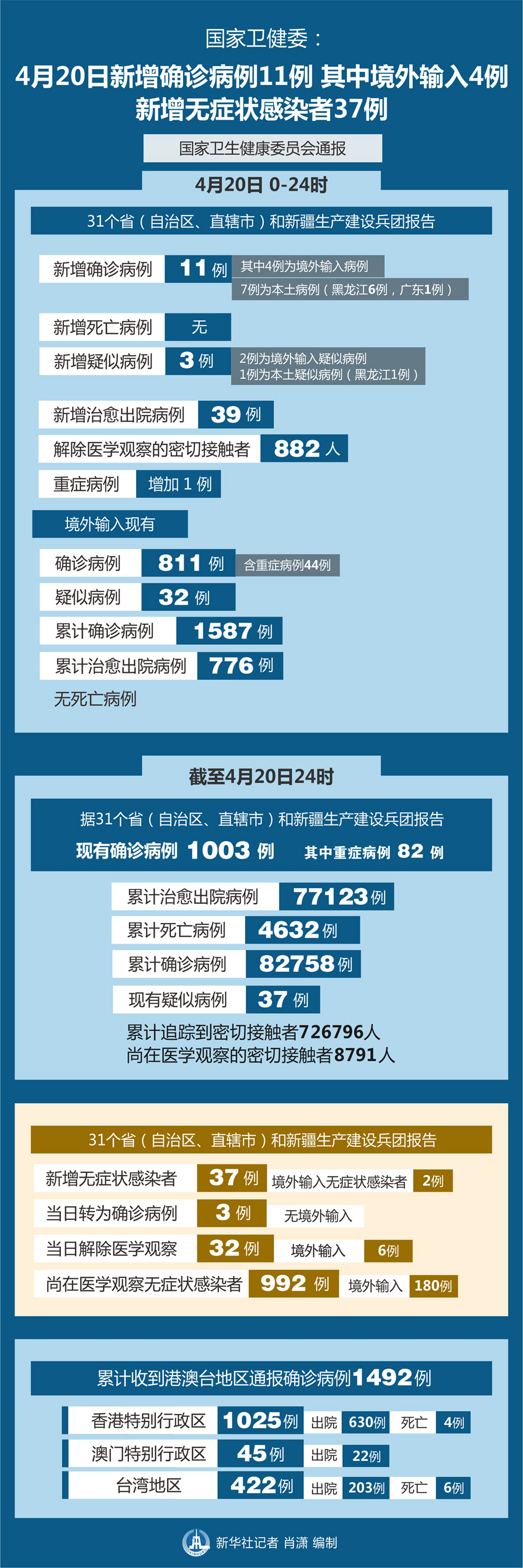 截至4月20日24時(shí),據(jù)31個(gè)省(自治區(qū)、直轄市)和新疆生產(chǎn)建設(shè)兵團(tuán)報(bào)告,現(xiàn)有確診病例1003例(其中重癥病例82例),累計(jì)治愈出院病例77123例,累計(jì)死亡病例4632例,累計(jì)報(bào)告確診病例82758例,現(xiàn)有疑似病例37例。累計(jì)追蹤到密切接觸者726797人,尚在醫(yī)學(xué)觀察的密切接觸者8791人。