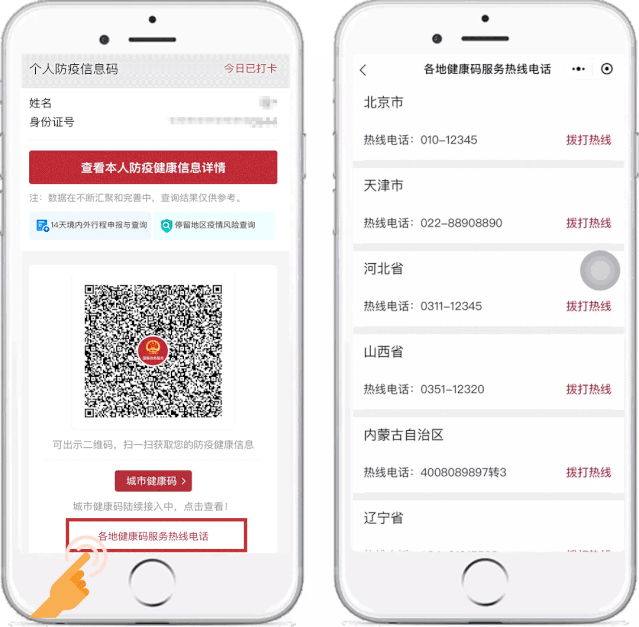 現(xiàn)在,在防疫信息碼的亮碼頁(yè)增加了“各地健康碼服務(wù)熱線電話”,用戶可通過(guò)服務(wù)熱線咨詢健康碼使用問(wèn)題。