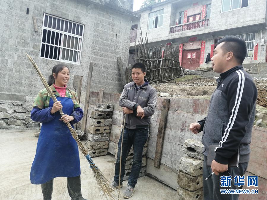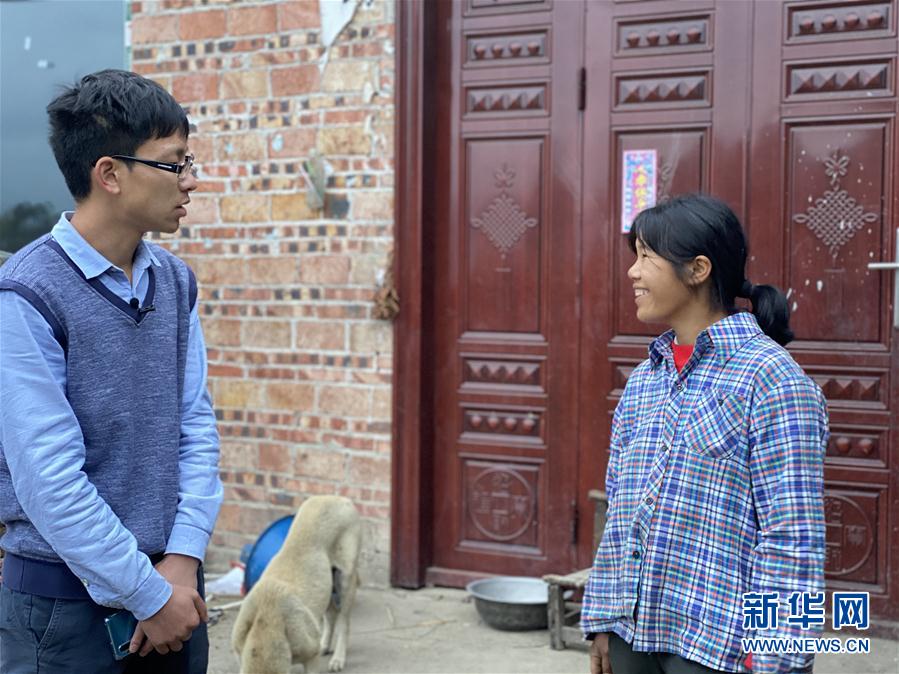 結束入戶調查后,廣西田林縣八渡瑤族鄉(xiāng)六林村駐村第一書記牟海迪(左)與貧困戶告別(4月24日攝)。 新華社記者 王軍偉 攝