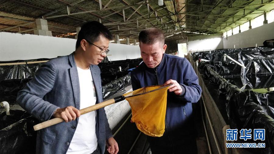 廣西上林縣西燕鎮(zhèn)岜獨村駐村第一書記康勇(左一)在龜鱉養(yǎng)殖場和養(yǎng)殖能人交流(4月24日攝)。 新華社記者 農(nóng)冠斌 攝