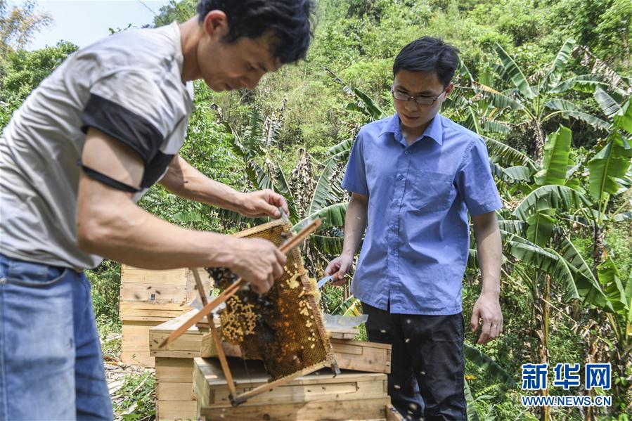 廣西樂業(yè)縣新化鎮(zhèn)百坭村扶貧工作隊員譚天社(右)與村民班華六在查看蜂巢(4月20日攝)。 新華社記者 曹祎銘 攝