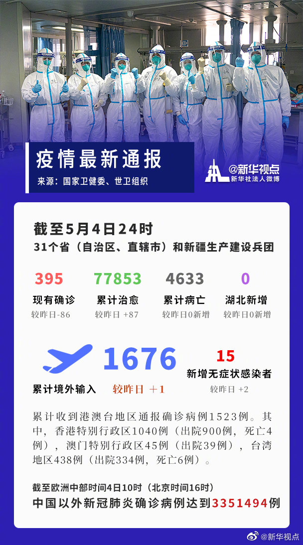 截至5月4日24時(shí),據(jù)31個(gè)?。ㄗ灾螀^(qū)、直轄市)和新疆生產(chǎn)建設(shè)兵團(tuán)報(bào)告,現(xiàn)有確診病例395例(其中重癥病例29例),累計(jì)治愈出院病例77853例,累計(jì)死亡病例4633例,累計(jì)報(bào)告確診病例82881例,現(xiàn)有疑似病例2例。累計(jì)追蹤到密切接觸者735240人,尚在醫(yī)學(xué)觀察的密切接觸者7152人。