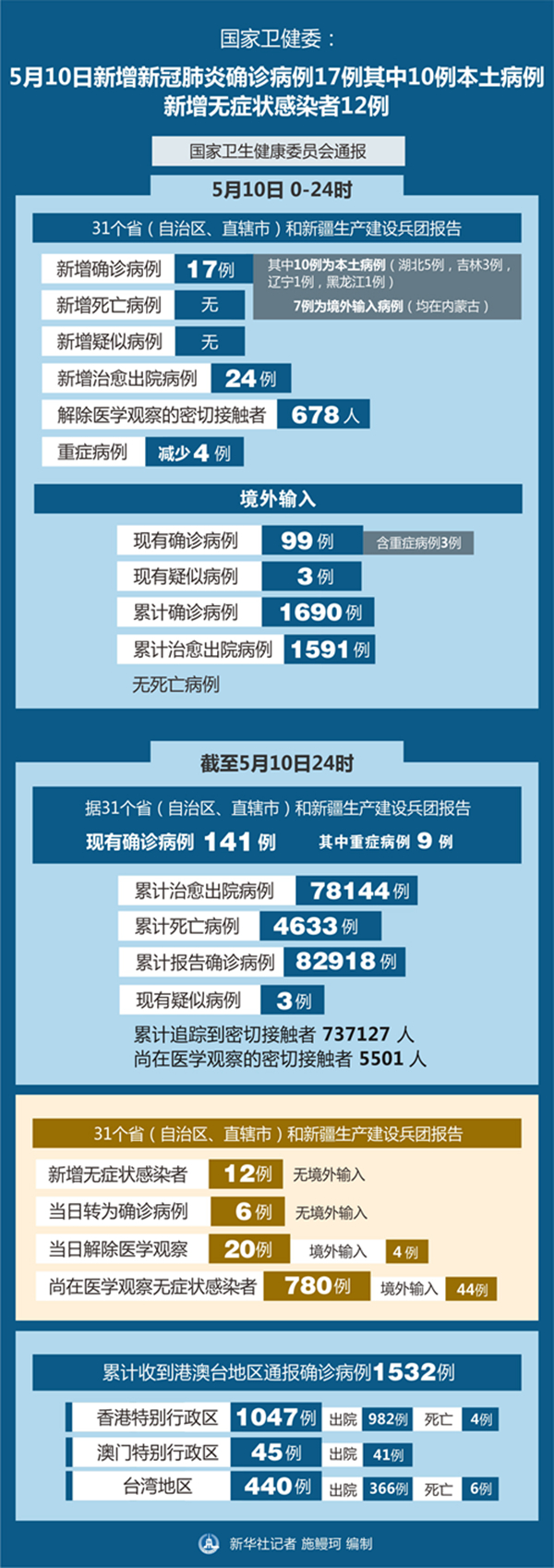 新華社北京5月11日電(記者屈婷)國家衛(wèi)生健康委員會(huì)11日通報(bào),5月10日0-24時(shí),31個(gè)省(自治區(qū)、直轄市)和新疆生產(chǎn)建設(shè)兵團(tuán)報(bào)告新增新冠肺炎確診病例17例,其中10例為本土病例(湖北5例,吉林3例,遼寧1例,黑龍江1例),7例為境外輸入病例(均在內(nèi)蒙古);無新增死亡病例;無新增疑似病例。