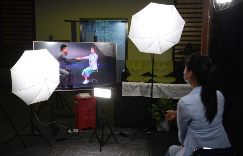 ↑本場訪談是新華社首次采用5G傳輸加全息成像技術進行采訪,使全國人大代表和主持人即使相隔千里也能實現(xiàn)“面對面”的交流。這是全國人大代表程桔在武漢演播室伸手,與北京的主持人高熹“云握手”。新華社記者 程敏 攝