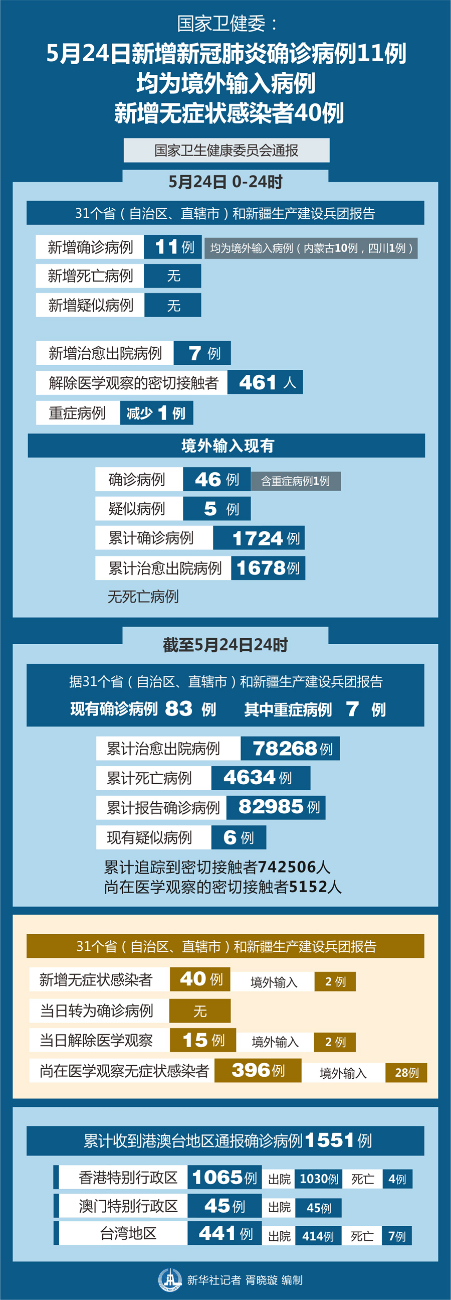 新華社北京5月25日電(記者王秉陽(yáng))國(guó)家衛(wèi)健委25日通報(bào),5月24日0-24時(shí),31個(gè)?。ㄗ灾螀^(qū)、直轄市)和新疆生產(chǎn)建設(shè)兵團(tuán)報(bào)告新增新冠肺炎確診病例11例,均為境外輸入病例(內(nèi)蒙古10例,四川1例);無(wú)新增死亡病例;無(wú)新增疑似病例。