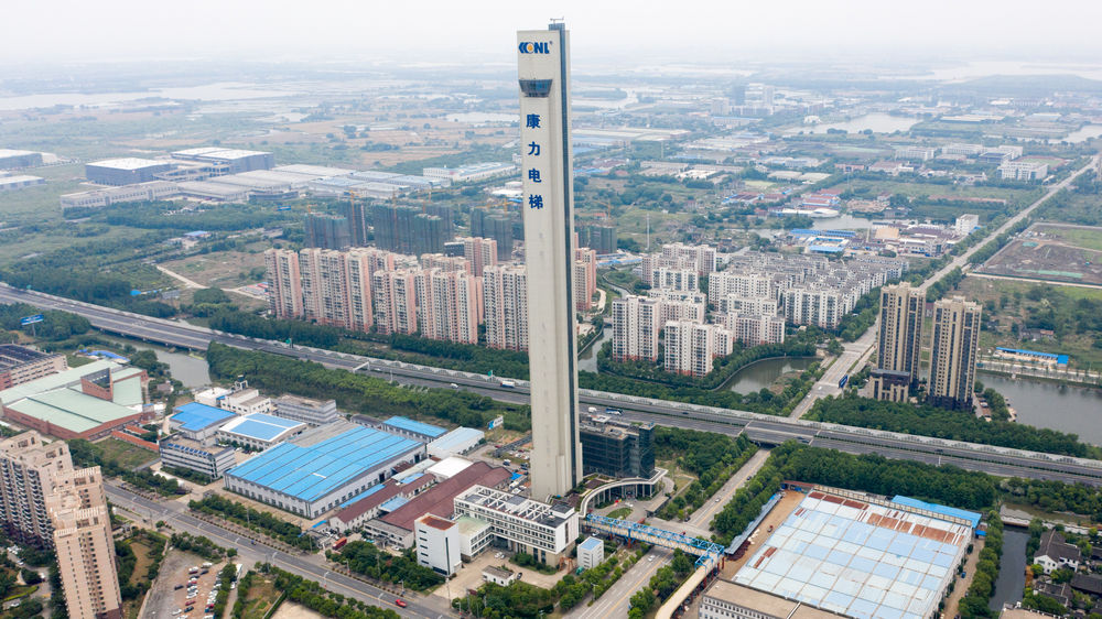 這是5月28日拍攝的江蘇蘇州市吳江區(qū)汾湖高新區(qū)的康力電梯試驗(yàn)塔(無人機(jī)照片)。新華社記者 李博 攝