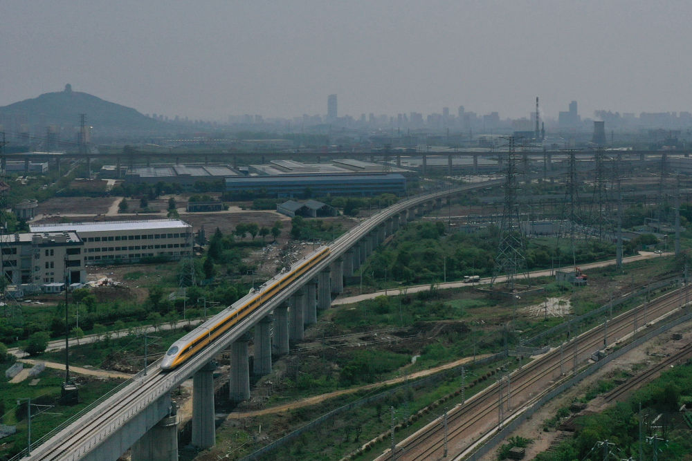 4月22日,在商合杭高鐵合肥至湖州段,聯(lián)調(diào)聯(lián)試綜合檢測列車經(jīng)過浙江湖州境內(nèi)(無人機(jī)照片)。新華社記者 黃宗治 攝