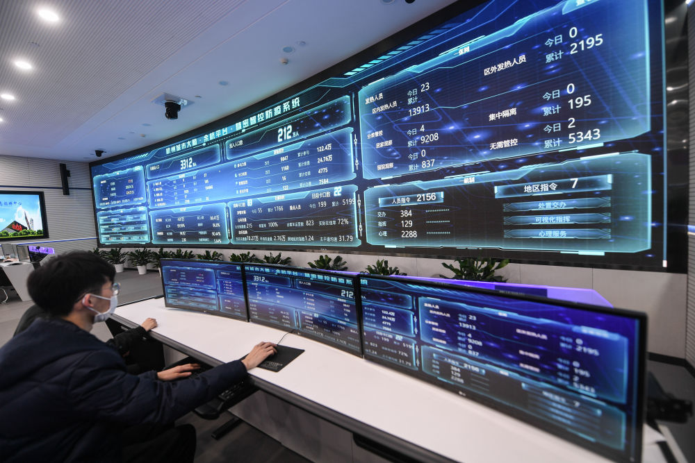 4月2日,在杭州市余杭區(qū)疫情防控工作領(lǐng)導(dǎo)小組指揮部內(nèi),杭州城市大腦精密智控防疫系統(tǒng)顯示疫情防控動(dòng)態(tài)各項(xiàng)實(shí)時(shí)數(shù)據(jù)。新華社記者 徐昱 攝