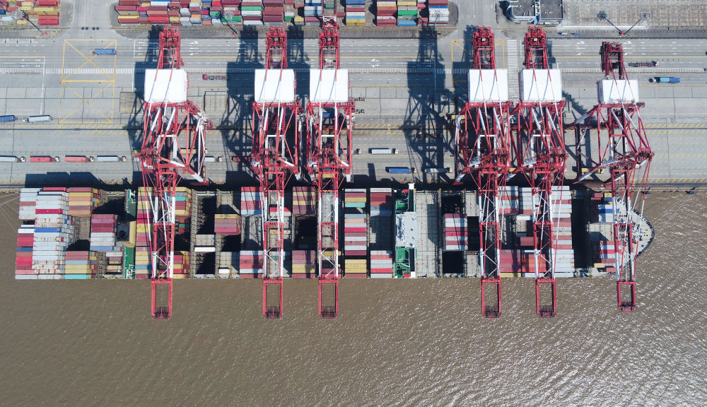 這是3月18日拍攝的上海洋山港集裝箱碼頭(無人機(jī)照片)。新華社記者 丁汀 攝