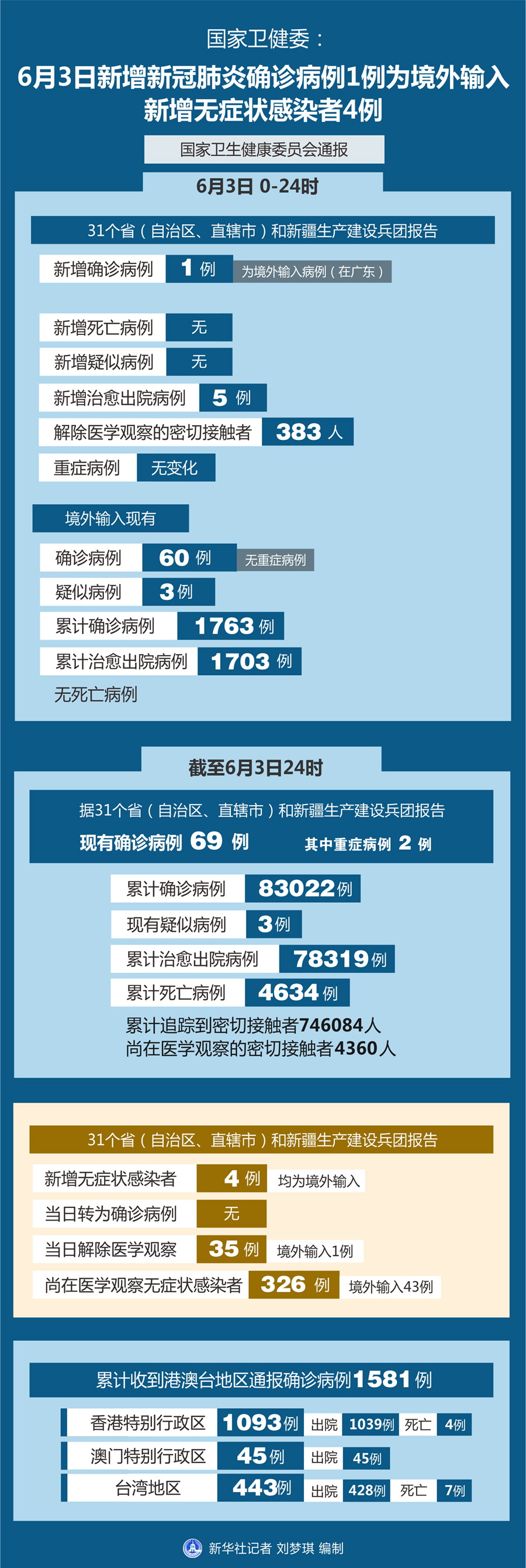 截至6月3日24時(shí),據(jù)31個(gè)省(自治區(qū)、直轄市)和新疆生產(chǎn)建設(shè)兵團(tuán)報(bào)告,現(xiàn)有確診病例69例(其中重癥病例2例),累計(jì)治愈出院病例78319例,累計(jì)死亡病例4634例,累計(jì)報(bào)告確診病例83022例,現(xiàn)有疑似病例3例。累計(jì)追蹤到密切接觸者746084人,尚在醫(yī)學(xué)觀察的密切接觸者4360人。