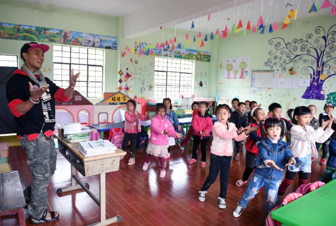 云南省西盟佤族自治縣勐梭鎮(zhèn)班母村佤山育忠幼兒園的孩子跟著老師上音樂課 楊宗友 攝