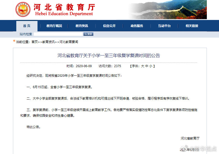 記者9日從河北省教育廳獲悉,河北省6月15日起全省小學一至三年級復學復課。復學復課前,小學一至三年級繼續(xù)開展線上教育教學工作。河北省教育廳要求各地要嚴格落實疫情防控常態(tài)化條件下復學復課各項防控措施和要求,確保校園安全和師生身心健康。大中小學全部復學復課后,合法線下教育培訓機構可提出線下開班申請,核驗合格,履行程序后有序恢復線下培訓。(記者李繼偉)