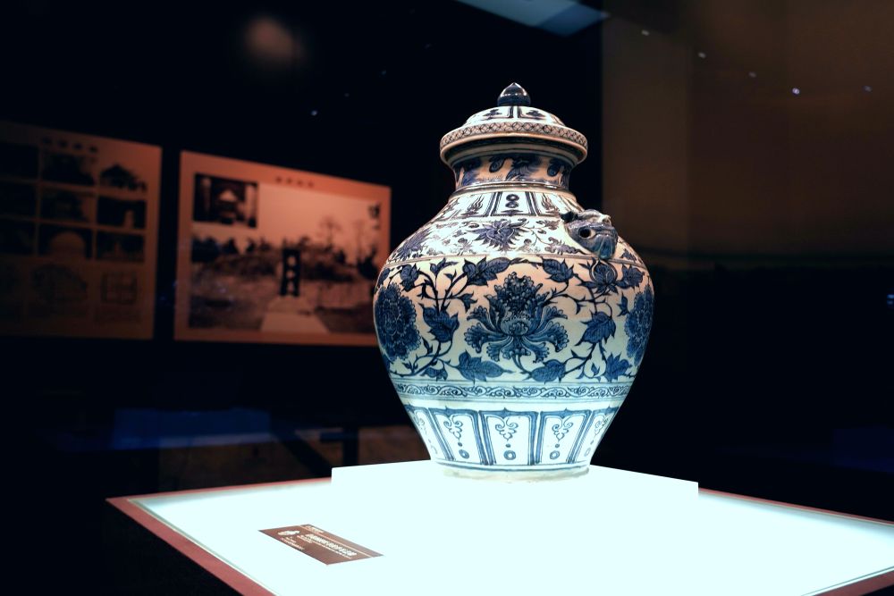 這件元青花纏枝牡丹紋獸耳蓋罐還蘊含著青花色料的民族文化融合故事?!敖?jīng)過科學(xué)檢測,它所使用青花料為自西亞地區(qū)進口的‘蘇麻離青’,在元代及明代早期,景德鎮(zhèn)窯所燒制的青花瓷器多使用此種青花原料?!奔居勒f,濃艷明快的蘇麻離青與淡雅清逸的中國青相輔相成,一同為世界展示中國青花瓷濃淡流轉(zhuǎn)的美妙。