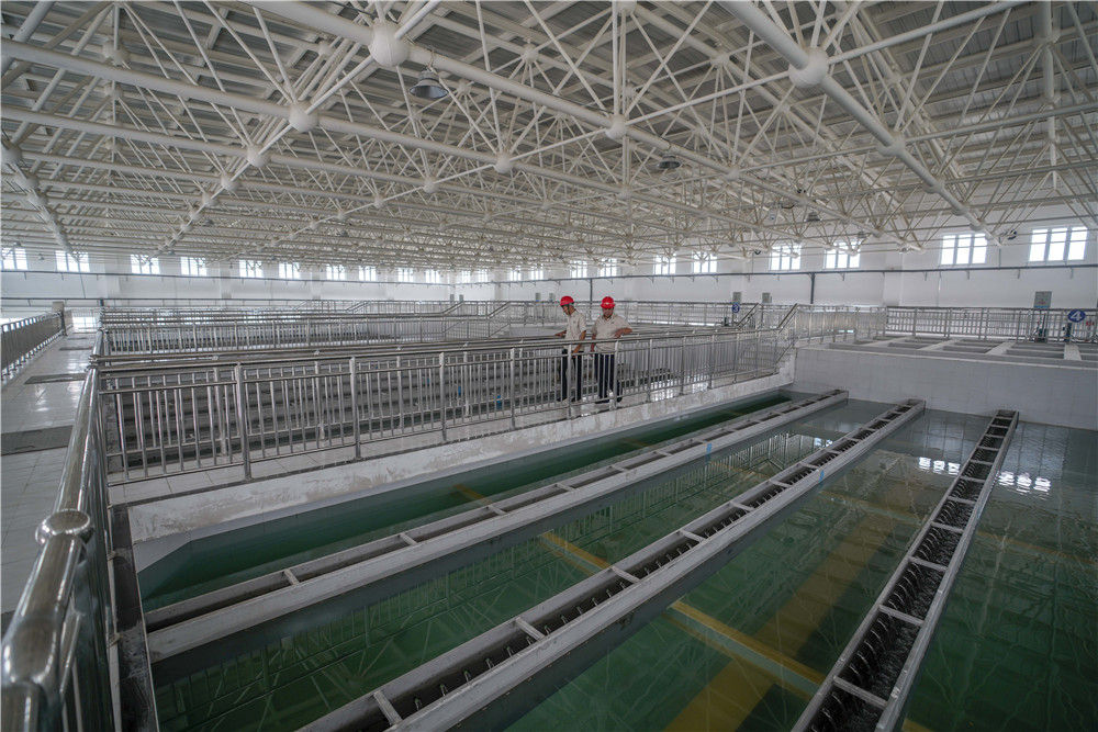 在新疆喀什地區(qū)城鄉(xiāng)供水總水廠里,工作人員檢查清水池工作情況(6月8日攝)。這些安全水將通過近112公里的主管道直達伽師縣,供應當?shù)鼐用裼盟?/span>新華社記者 趙戈 攝