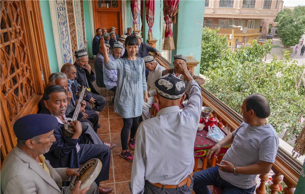 在新疆喀什老城的“百年茶館”,游客和當?shù)夭杩瓦吰凡柽呅蓍e(5月17日攝)。新華社記者 趙戈 攝