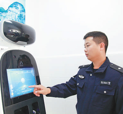 織金縣珠藏鎮(zhèn)警務(wù)助理肖發(fā)陽在展示智能機器人如何使用。黃 嫻攝