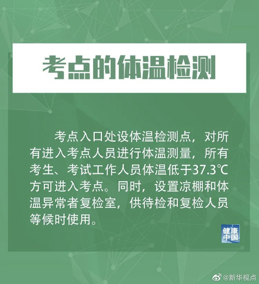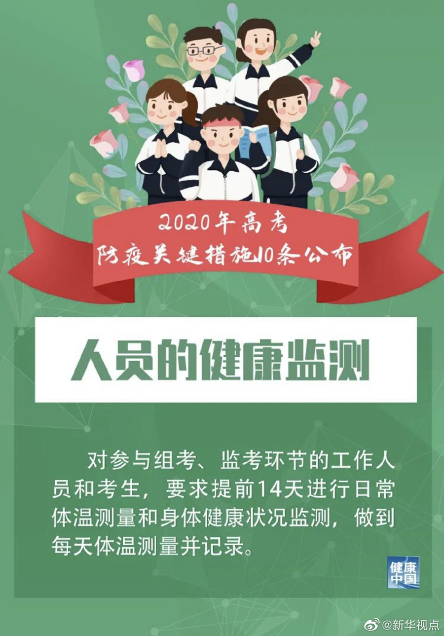 此外,措施提到,對參與組考、監(jiān)考環(huán)節(jié)的工作人員和考生,要求提前14天進(jìn)行日常體溫測量和身體健康狀況監(jiān)測,做到每天體溫測量并記錄。