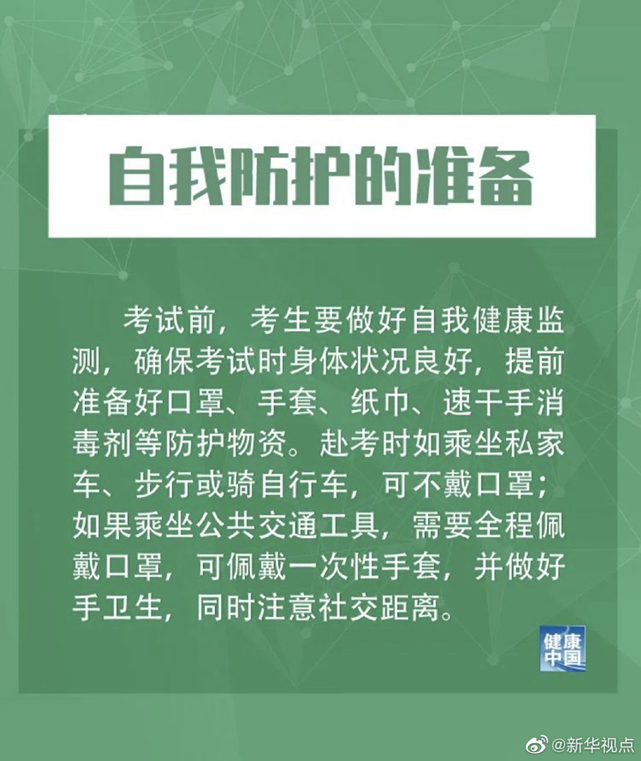 措施提到,低風(fēng)險地區(qū)的考生在進(jìn)入考場前要佩戴口罩,進(jìn)入考場就座后,可以自主決定是否佩戴;備用隔離考場和中高風(fēng)險地區(qū)的考生,要全程佩戴口罩。工作人員和監(jiān)考人員全程佩戴口罩,隔離考場的監(jiān)考員及工作人員須穿戴工作服、醫(yī)用防護(hù)口罩和一次性手套等,必要時可穿戴防護(hù)服。