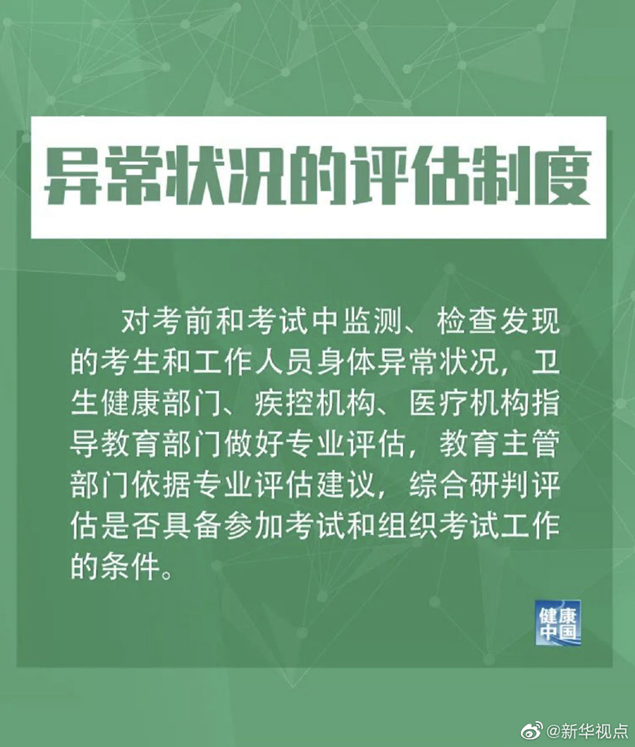 考試過程中有發(fā)熱、咳嗽等呼吸道癥狀者,措施提到,由考點(diǎn)當(dāng)?shù)氐男l(wèi)生健康部門、疾控機(jī)構(gòu)和醫(yī)療機(jī)構(gòu)專業(yè)人員進(jìn)行個案研判,具備繼續(xù)完成考試條件的考生,須安排在備用隔離考場考試??忌鷱钠胀紙鲛D(zhuǎn)移至備用隔離考場(未出考點(diǎn))所耽誤的時間,經(jīng)省級招生考試機(jī)構(gòu)批準(zhǔn)予以補(bǔ)齊。當(dāng)科目考試結(jié)束時,由負(fù)責(zé)研判的專業(yè)人員當(dāng)場簡要向所有考生進(jìn)行解釋和說明,避免其他考生恐慌。