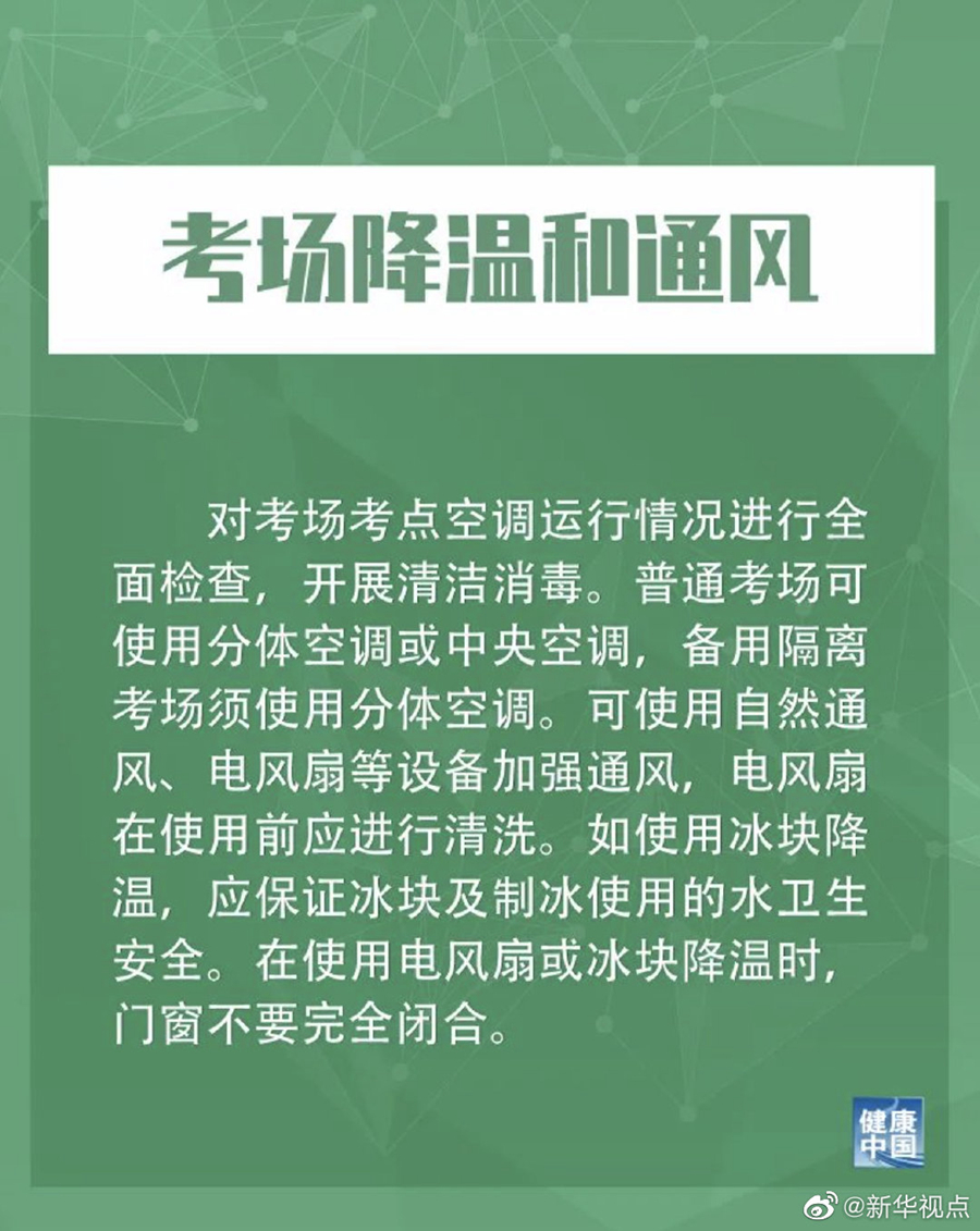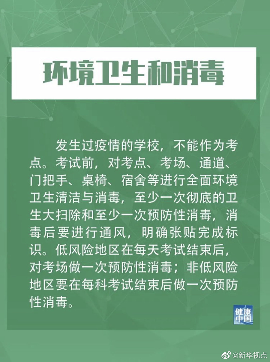 措施提到,發(fā)生過疫情的學(xué)校,不能作為考點(diǎn)。低風(fēng)險地區(qū)在每天考試結(jié)束后,對考場做一次預(yù)防性消毒;非低風(fēng)險地區(qū)要在每科考試結(jié)束后做一次預(yù)防性消毒。