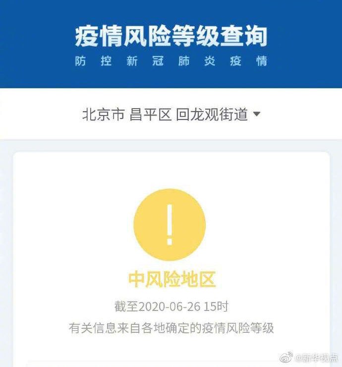 根據(jù)國(guó)務(wù)院客戶端小程序“疫情風(fēng)險(xiǎn)等級(jí)查詢”,截至6月26日15時(shí),北京市西城區(qū)月壇街道由中風(fēng)險(xiǎn)地區(qū)變更為低風(fēng)險(xiǎn)地區(qū)。海淀區(qū)四季青(地區(qū))鎮(zhèn)、昌平區(qū)回龍觀街道升級(jí)為中風(fēng)險(xiǎn)地區(qū)。