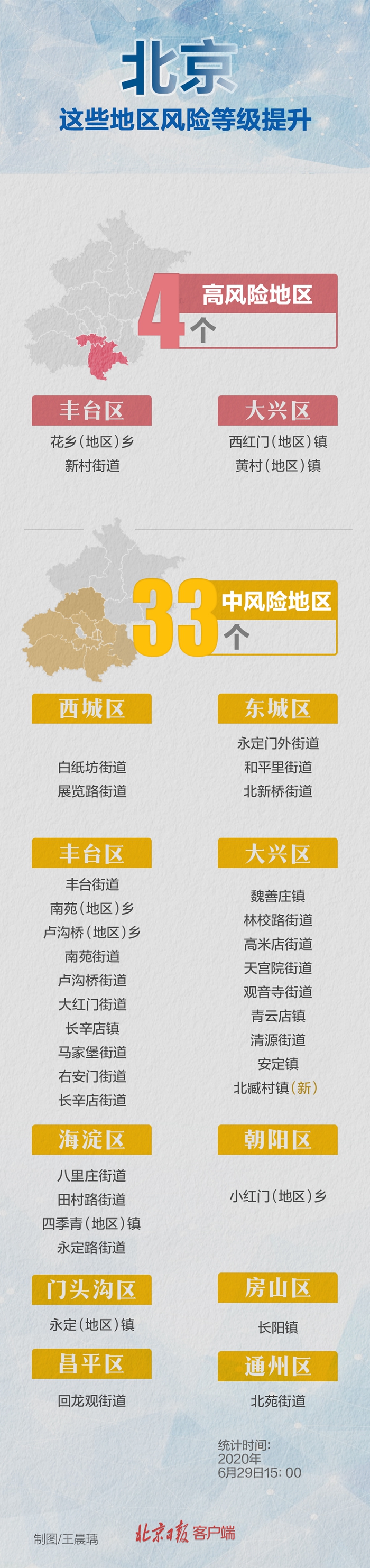 截至目前,本市已有33個(gè)中風(fēng)險(xiǎn)地區(qū),涉及豐臺(tái)區(qū)、大興區(qū)、海淀區(qū)、西城區(qū)、房山區(qū)、東城區(qū)、朝陽(yáng)區(qū)、門頭溝區(qū)、通州區(qū)、昌平區(qū)10個(gè)區(qū)。另有4個(gè)高風(fēng)險(xiǎn)地區(qū),分別位于豐臺(tái)區(qū)、大興區(qū)。