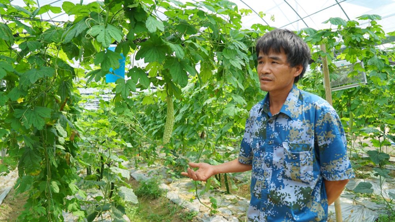 沿著寬敞的瀝青馬路進(jìn)入禾豐鎮(zhèn)陂角村,首先映入眼簾的是田間地頭一座座現(xiàn)代化的蔬菜大棚。在一個(gè)10畝的蔬菜大棚里,貧困戶謝來龍正帶著2位村民在自家地里忙著摘苦瓜。