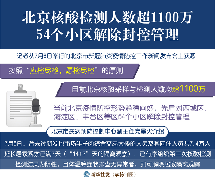 新華社北京7月6日電(記者關(guān)桂峰、田晨旭)記者從6日舉行的北京市新冠肺炎疫情防控工作新聞發(fā)布會(huì)上獲悉,按照“應(yīng)檢盡檢,愿檢盡檢”的原則,目前北京核酸采樣與檢測(cè)人數(shù)均超1100萬(wàn)。當(dāng)前北京疫情防控形勢(shì)趨穩(wěn)向好,先后對(duì)西城區(qū)、海淀區(qū)、豐臺(tái)區(qū)等區(qū)54個(gè)小區(qū)解除封控管理。