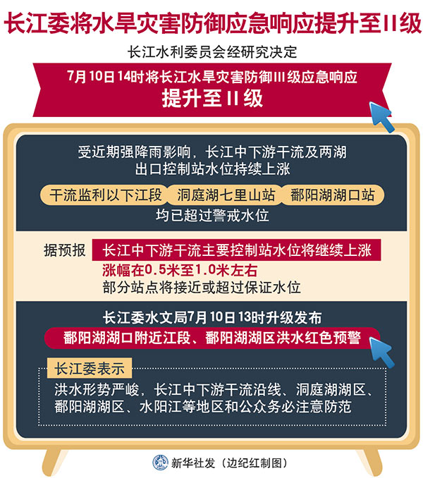 新華社武漢7月10日電(記者李思遠、樂文婉)鑒于當前長江流域洪水防御的嚴峻形勢,長江水利委員會經(jīng)研究決定,10日14時將長江水旱災害防御Ⅲ級應急響應提升至Ⅱ級。