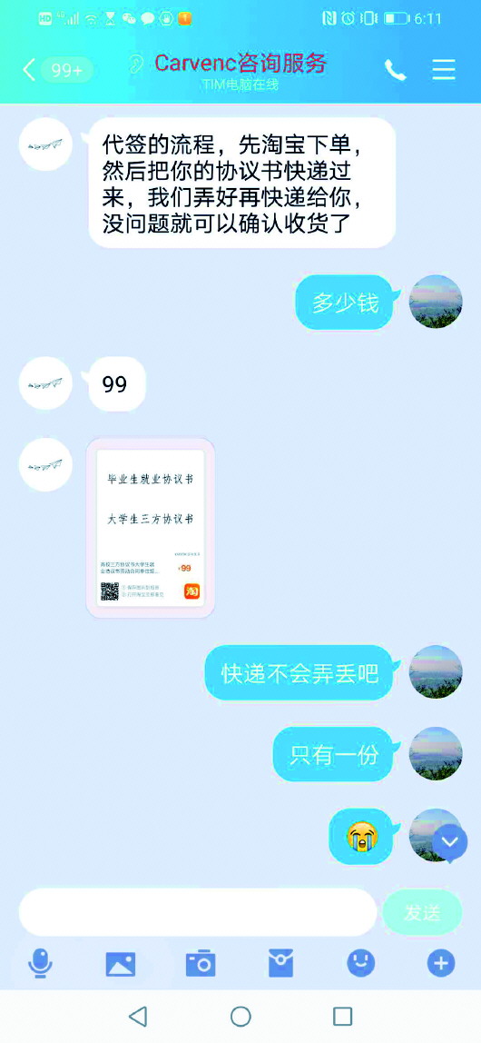 記者調(diào)查發(fā)現(xiàn),一些學(xué)校周邊打印店和淘寶賣家,也公然做起簽字蓋章生意?!皩?shí)在找不到工作單位的,我給你們支個(gè)招,去打印店搞一下,十幾元就能搞定?!睘樽寣W(xué)生盡快在大學(xué)生就業(yè)服務(wù)平臺(tái)登記、更新就業(yè)信息,安徽農(nóng)業(yè)大學(xué)經(jīng)濟(jì)技術(shù)學(xué)院某班主任在班級(jí)群里,發(fā)了一個(gè)可代簽三方協(xié)議的聯(lián)系人方式。