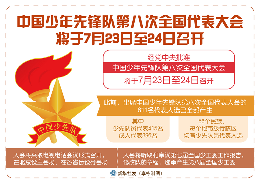 新華社北京7月20日電(記者王鵬)經(jīng)黨中央批準(zhǔn),中國少年先鋒隊第八次全國代表大會將于7月23日至24日召開。目前,大會的各項籌備工作進(jìn)展順利。