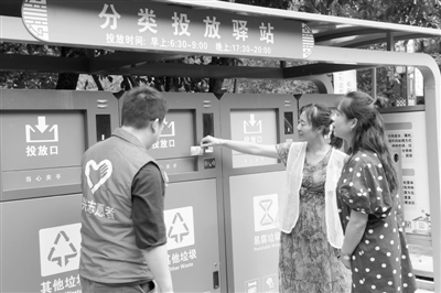 在金華市金東區(qū)的每個垃圾投放點附近,都有一名垃圾巡檢員會協(xié)助居民做好分類,定時、定點投放垃圾。