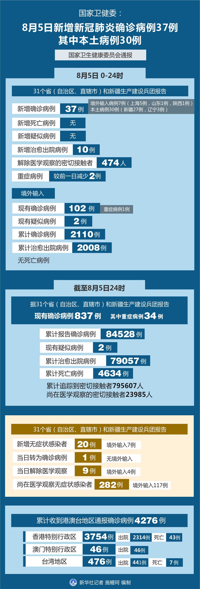 截至8月5日24時,據(jù)31個?。ㄗ灾螀^(qū)、直轄市)和新疆生產(chǎn)建設(shè)兵團報告,現(xiàn)有確診病例837例(其中重癥病例34例),累計治愈出院病例79057例,累計死亡病例4634例,累計報告確診病例84528例,現(xiàn)有疑似病例2例。累計追蹤到密切接觸者795607人,尚在醫(yī)學觀察的密切接觸者23985人。