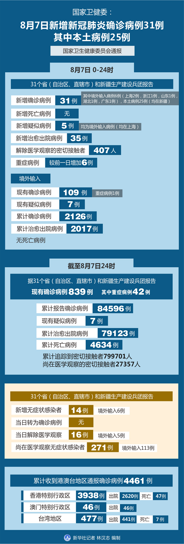 截至8月7日24時,據(jù)31個?。ㄗ灾螀^(qū)、直轄市)和新疆生產(chǎn)建設(shè)兵團報告,現(xiàn)有確診病例839例(其中重癥病例42例),累計治愈出院病例79123例,累計死亡病例4634例,累計報告確診病例84596例,現(xiàn)有疑似病例7例。累計追蹤到密切接觸者799701人,尚在醫(yī)學(xué)觀察的密切接觸者27357人。