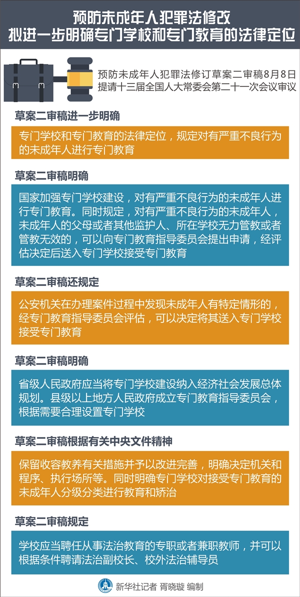據(jù)了解,為貫徹落實(shí)有關(guān)中央文件精神,加強(qiáng)專門學(xué)校建設(shè)和專門教育工作,草案二審稿明確,國(guó)家加強(qiáng)專門學(xué)校建設(shè),對(duì)有嚴(yán)重不良行為的未成年人進(jìn)行專門教育。同時(shí)規(guī)定,對(duì)有嚴(yán)重不良行為的未成年人,未成年人的父母或者其他監(jiān)護(hù)人、所在學(xué)校無(wú)力管教或者管教無(wú)效的,可以向?qū)iT教育指導(dǎo)委員會(huì)提出申請(qǐng),經(jīng)評(píng)估決定后送入專門學(xué)校接受專門教育。