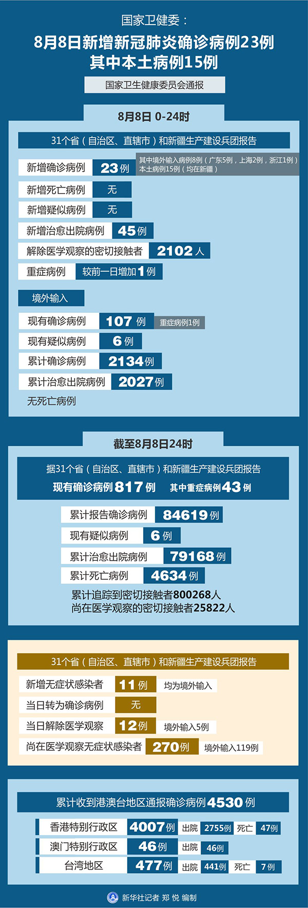 截至8月8日24時,據(jù)31個省(自治區(qū)、直轄市)和新疆生產(chǎn)建設(shè)兵團(tuán)報告,現(xiàn)有確診病例817例(其中重癥病例43例),累計治愈出院病例79168例,累計死亡病例4634例,累計報告確診病例84619例,現(xiàn)有疑似病例6例。累計追蹤到密切接觸者800268人,尚在醫(yī)學(xué)觀察的密切接觸者25822人。