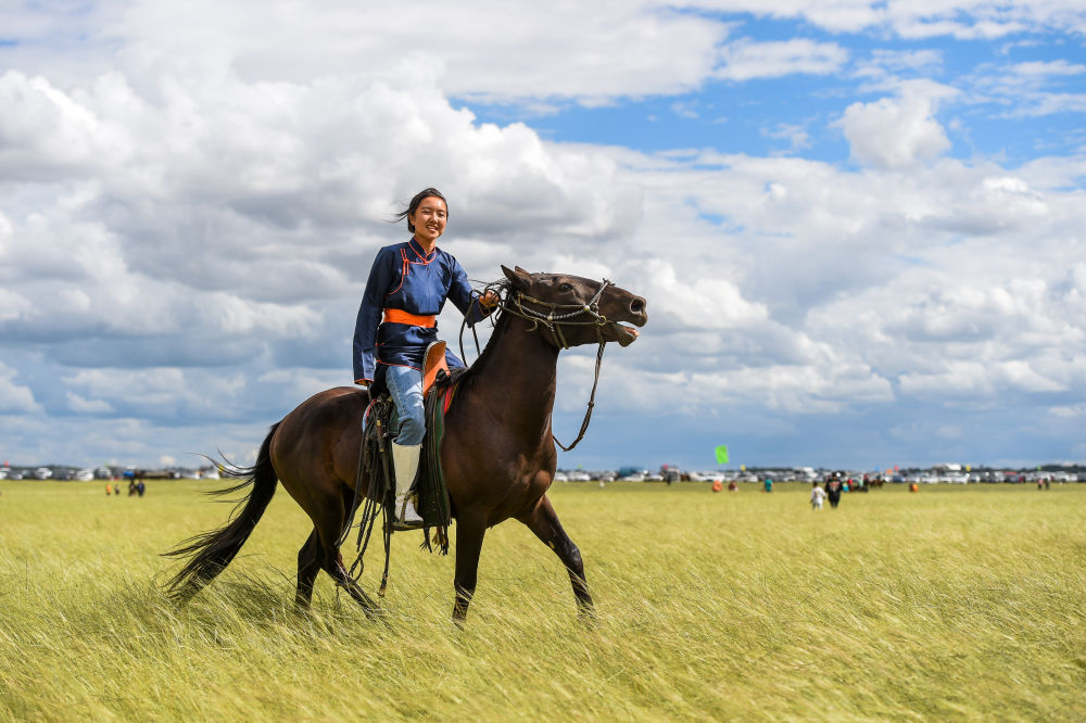 8月3日,錫林花在那達慕會場上騎馬。