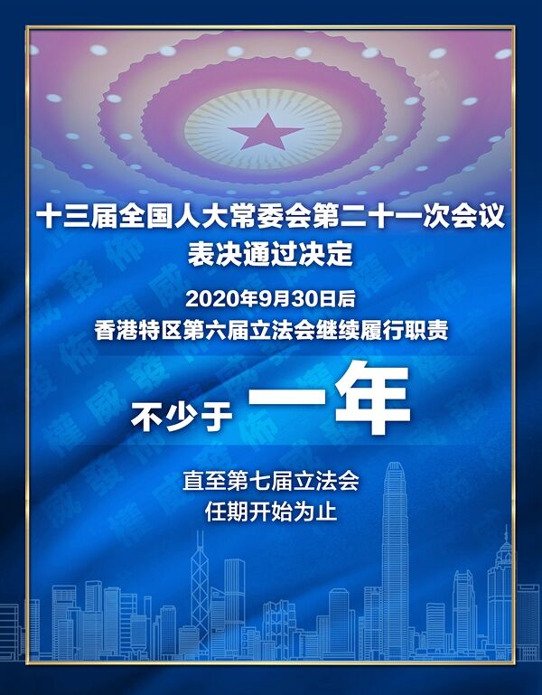 根據(jù)決定,2020年9月30日后,香港特別行政區(qū)第六屆立法會繼續(xù)履行職責,不少于一年,直至香港特別行政區(qū)第七屆立法會任期開始為止。香港特別行政區(qū)第七屆立法會依法產(chǎn)生后,任期仍為四年。