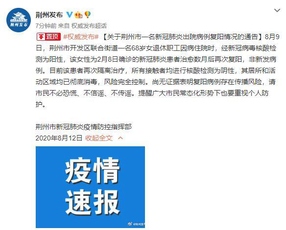 據(jù)湖北省荊州市新冠肺炎疫情防控指揮部12日通報(bào),8月9日,荊州市開發(fā)區(qū)聯(lián)合街道一名68歲女退休職工因病住院時(shí),經(jīng)新冠病毒核酸檢測(cè)為陽(yáng)性,該女性為2月8日確診的新冠肺炎患者治愈數(shù)月后再次復(fù)陽(yáng),非新發(fā)病例。目前該患者再次隔離治療,所有接觸者均進(jìn)行核酸檢測(cè)為陰性,其居所和活動(dòng)區(qū)域均已徹底消毒,風(fēng)險(xiǎn)完全控制。尚無(wú)證據(jù)表明復(fù)陽(yáng)病例存在傳播風(fēng)險(xiǎn),請(qǐng)市民不必恐慌、不信謠、不傳謠。提醒廣大市民常態(tài)化形勢(shì)下也要重視個(gè)人防護(hù)。