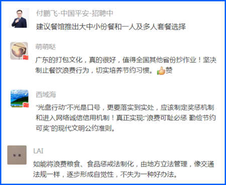 總書記強(qiáng)調(diào),要加強(qiáng)立法,強(qiáng)化監(jiān)管,采取有效措施,建立長(zhǎng)效機(jī)制,堅(jiān)決制止餐飲浪費(fèi)行為。網(wǎng)友們就此積極獻(xiàn)計(jì)獻(xiàn)策。