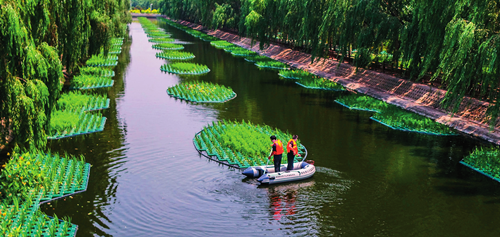 河北省雞澤縣在河道治理中采用“生態(tài)浮島”技術(shù),種植挺水植物,既美化了河道,又凈化了水體,達(dá)到了生態(tài)治污效果(6 月 20 日攝)王曉攝