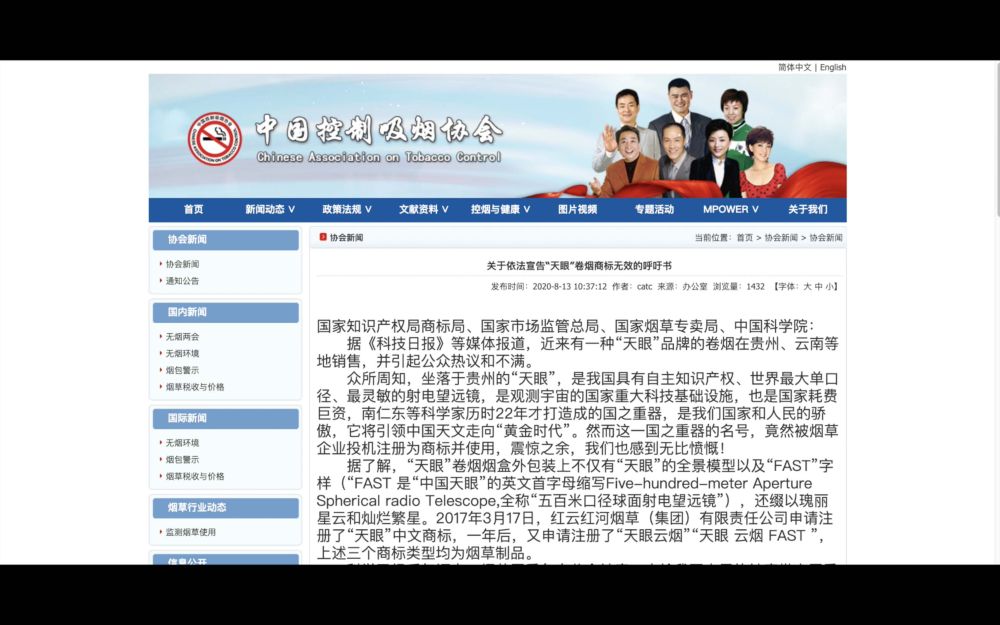 針對(duì)“天眼”被煙草企業(yè)注冊(cè)商標(biāo)并使用一事,中國控制吸煙協(xié)會(huì)8月13日在其官網(wǎng)發(fā)布聲明,希望國家知識(shí)產(chǎn)權(quán)局商標(biāo)局等部門對(duì)此事予以關(guān)注。