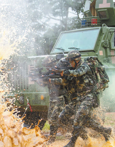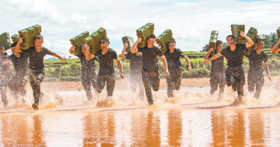 中隊(duì)官兵扛著彈藥箱在泥水中訓(xùn)練沖刺。本報(bào)記者 金 歆攝