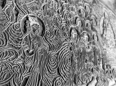 隨著白富鋼的五指輕盈地在古老的木板上游走,一塊木質(zhì)經(jīng)板上縱橫的紋理逐漸明晰起來。這批經(jīng)板始刻于清雍正十一年(公元1733年),完成于清乾隆三年(公元1738年),是我國漢文大藏經(jīng)卷帙中收錄最豐富,也是最后一部官方雕印本。經(jīng)板共計79036塊,總重達400噸??胺Q我國木板經(jīng)書之最。