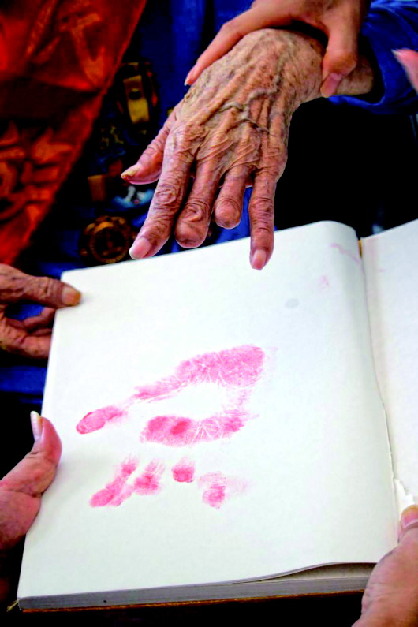 “我們一直在想辦法為抗戰(zhàn)老兵留下一些印記。最開始想出影集,可是考慮到經費的原因,我們決定留手印?!薄昂侠媳摇必撠熑死萧~說,留手印是既有紀念意義、又“花錢少”的方式,“我們的經費很寶貴,每一分錢都要直接用在老兵身上?!?/p>